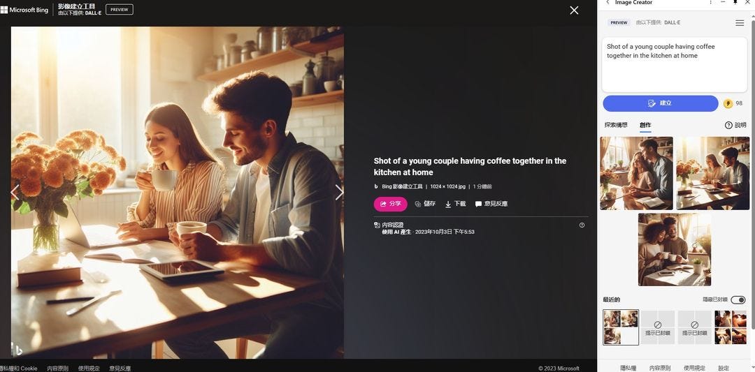 2.使用Edge瀏覽器,搜尋Bing Image Creator,把那行英文敘述貼進去就可以產生圖片,每天可以做100張